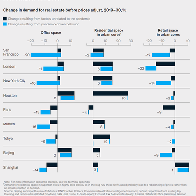 Mckinsey 的研究显示,在温和的场景建模情景中,2030 年全球重点城市对办公空间的需求会对比 2019 年低 13%(中位城市);受影响最严重的城市需求会下降 38%。