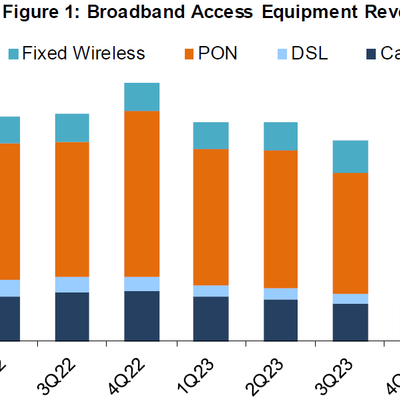 Dell Oro 咨询公司研究显示,2024Q1 全球固定宽带接入侧设备(PON + xDSL + Cable + FWA)收入体量为 41 亿美元,同比减少了 12%。