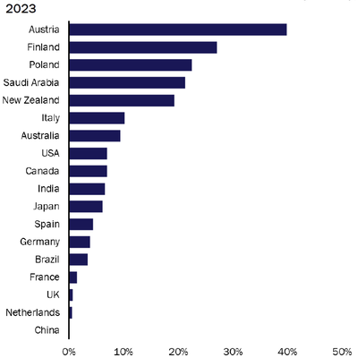从整体来看,增速持续放缓是大趋势。但美国的移动流量在 2023 年有一个明显的增幅上升,这是因为 5G 固定无线接入(FWA)发挥了大的作用。