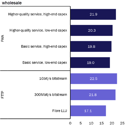 Analysys Mason 咨询公司研究了 5G FWA 和 FTTP(Fiber to the Premises,等同于光纤入户,ONU 放置在客户处)的 TCO 整体成本比较。