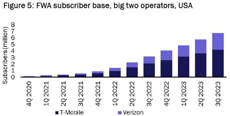 T-Mobile 原本是移动运营商,借助 5G FWA 的技术优势,成为这两年美国新增宽带的最大赢家。