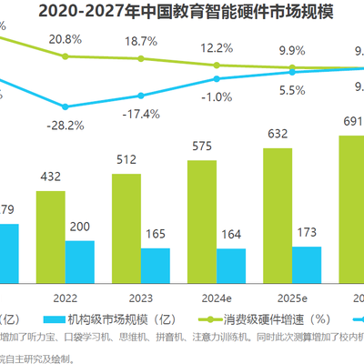 艾瑞咨询的研究显示,中国教育智能硬件的市场规模在 2024 年校外消费 575 亿元,校内机构 164 亿元。预计到 2027 年总规模接近 1,000 亿元。