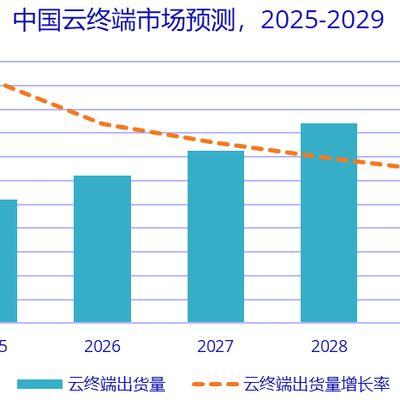 预计到 2029 年云终端出货量将突破 962 万台,五年复合增长率为 16.6%。