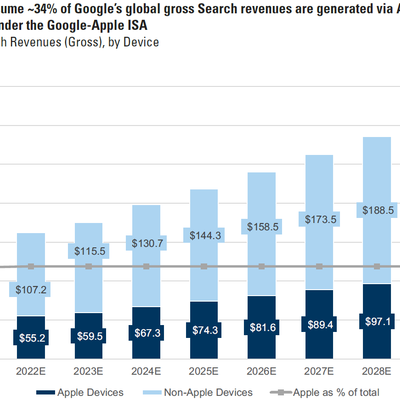 Goldman Sachs 研究显示,Google 全球搜索广告收入中,有 34% 左右来自 Apple 的各类终端。