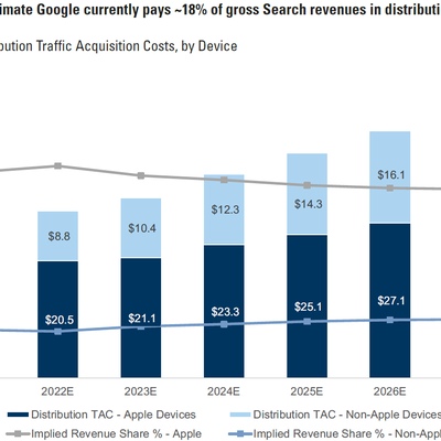 Goldman Sachs 研究显示,Google 搜索广告收入中有 18% 付给了流量获取成本(Traffic Acquisition Costs)。这其中,Apple 拿走了大头,大约占总量成本的 65%。