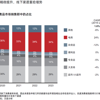 贝恩公司和凯度的研究显示,电商渠道在中国城镇快速消费品市场的市场份额在 2022-2023 未取得提升,电商的销售额增速远低于 2019-2021,甚至更早的时期。