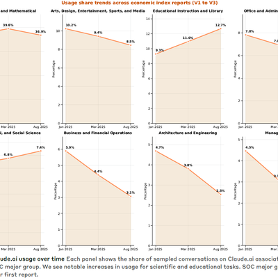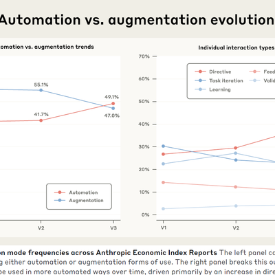 附图右侧按协作模式对此进行了细分。随着时间的推移,Claude往往以更自动化的方式使用,这主要是由于指令使用的增加。