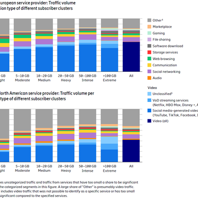具体来说,流量使用前 10% 的用户使用了全网 70% 的流量。北美每月流量(DOU)20GB 以上的用户占全网用户总量的 14%,但使用了 80% 的总流量;欧洲每月流量 20GB 以上的用户占全网用户总量的 17%, 但使用了 81% 的总流量。