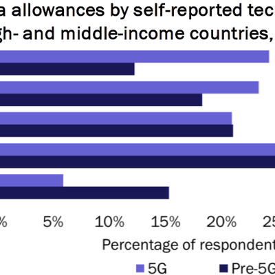 Analysys Mason 咨询公司在 2023 年针对中高收入国家的消费者调研,升级到 5G 和之前每月户均流量的变化。