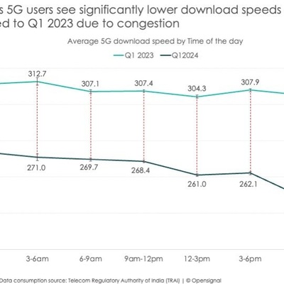 Opensignal 对印度网络的测速数据显示,印度 5G 的用户体验速率 2024Q1 对比一年前有持续的下滑。于此同时,印度的 5G 流量使用大幅增加。