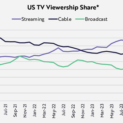 2021-2023 美国大屏的收视率份额,流媒体视频的份额从 25% 提升到 35%,有线电视从 40% 下降到低于 30%。