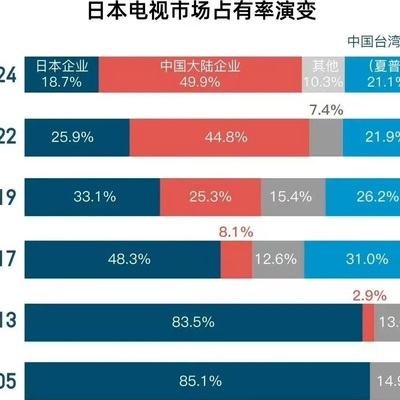 日经中文网绘制了一张图对比了 2005 到 2024 日本本土电视机市场的份额变化,来自中国大陆的企业的电视机占有率从零基础增长到了 49.9% 接近一半。