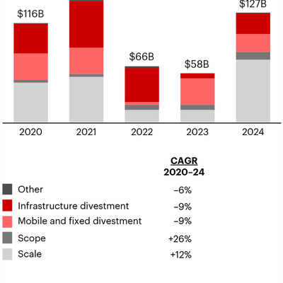 Bain 公司汇总了全球电信运营商在 2020 - 2024 年的并购案例。五年总计 5,180 亿美元的交易额中,39% 来自运营商规模的扩展,31% 来自基础设施的转让。