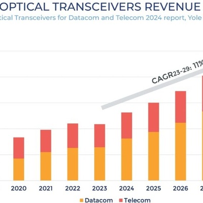 Yole 数据现实,2022~2023 年全球光模块市场空间在 110 亿美元左右。由于云服务商、电信运营商对 400G 及以上传输速率的需求增加,以及 AI 计算集群的推动的数据中心网络的速率上升,预计到 2029 年全球光模块市场空间可达 224 亿美元。