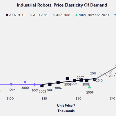 ARK 基于 IFR 的数据,绘制了自 1996 年以来历年工业机器人的销售出货量和平均价格。