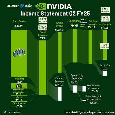 从英伟达 Nvidia 2025 财年 Q2 的收入结构看,数据中心贡献了 263 亿美元,而汽车只贡献了 3 亿美元,即便英伟达近年在加强汽车自动化的技术研发。