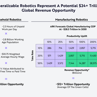 ARK Fund 对通用机器人的市场前景极为看好。其认为到 2030 年,全球家用机器人的市场空间可达 12.5 万亿美元,而制造业的通用机器人也会达到 12 万亿美元。两者合计 24 万亿美元。