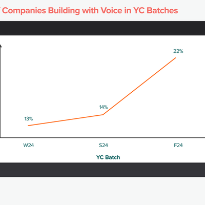 2023 年秋冬季 YC 孵化公司中,使用 AI 语音的创业公司比例为 13%。而到了 2024 年秋冬季的批次中,这一比例提升到 22%。