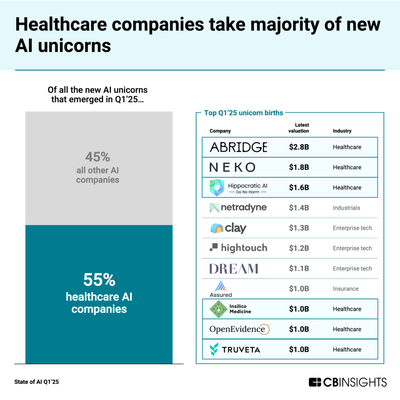 CB Insights 数据显示,2025Q1 一共有 11 家 AI 创业公司的估值超过 10 亿美金,晋升独角兽俱乐部。