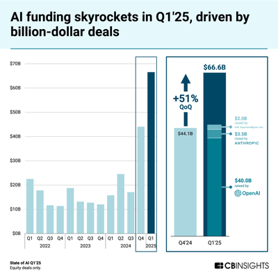 CB Insights 监测数据显示,2025Q1 全球 AI 风险投资达到 666 亿美元,大头来自两个超级头部 —— OpenAI 和 Anthropic。