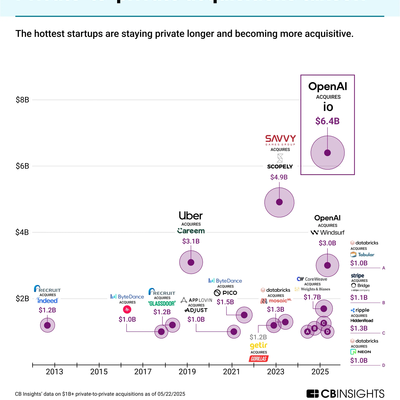 附图是 CB Insights 汇总了近年的代表性收购案,所谓 “未上市初创公司收购初创公司”。最新的案例是 OpenAI 以 64 亿美金收购 iPhone 前设计师 Jony Ive 的智能硬件公司。