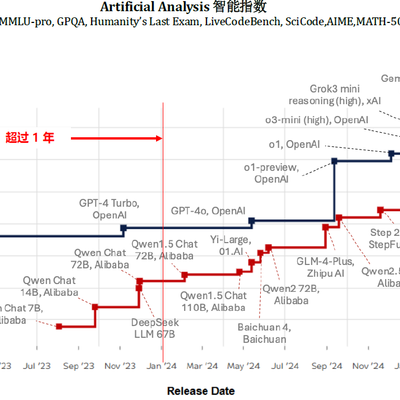 研究机构 Artificial Analysis 的智能指数综合了 MMLU-Pro、GPQA 等多种大模型基准测试结果,分析显示,2022 ~ 2023 美国基础大模型要比中国领先一年,而 2025 年差距缩小到了三个月。
