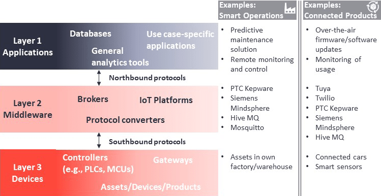 IoT Analytics 咨询公司归纳了一个精简的三层软件结构,可用来描述现代 IoT 项目得层次分布。
