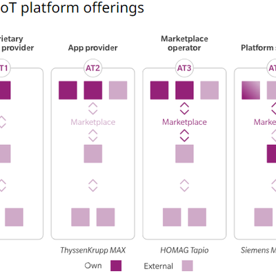 Microsoft Azure 定位基础设施层和平台层为主;Siemens Mindsphere 定位特定垂直领域的专家;HOMAG Tapio 定位应用市场;ThyssenKrupp MAX 定位特定工业应用服务商。