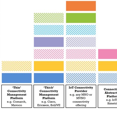 原本相对薄的一个平台层也变得日趋丰富。附图是 Transforma Insights 新近定义的分类,其讲物联网连接管理平台分为五类,附图也给出了每类的重点和代表性玩家。