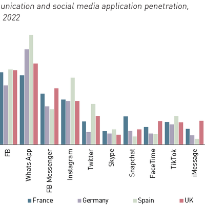 Analysys Mason 的调研数据显示,Meta 旗下的 WhatsApp 和 Facebook 是法国、德国、西班牙和英国四国用户渗透率最高的 OTT 消息应用。