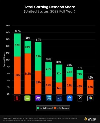 Parrot 数据显示,Netflix 在 2022 年拿到了美国流媒体视频网站播放量的 17.7% 份额,位居第一,Hulu 和 HBO Max 位居第二三位。