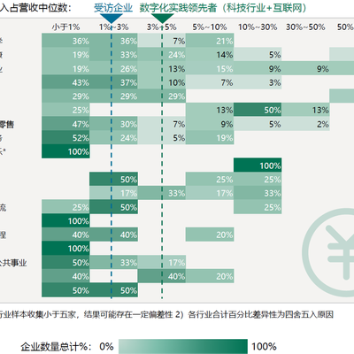 受访企业的数字化投资占营收的中位数处于 1%~3% 的区间内。数字化实践领先者数字化投入力度相对更大,中位数处于 3%~5% 的区间内。