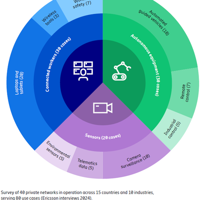 爱立信针对国际市场的 40 个 5G 专网现网案例进行调研,这些横跨 10 个行业的 80 个应用场景 Use Case,可归为三大类: (1) Connected Workers;(2) 自主化设备;(3) 传感器类。
