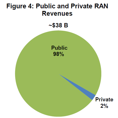 以 2023 年为例,Dell’Oro 研究显示整个无线侧的网络设备空间为 380 亿美元,其中 98% 为运营商面向大众的公共网络。