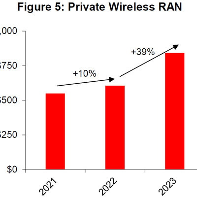 基于蜂窝网络的全球无线专网(4G 和 5G)在 2023 年的销售变现比 2022 年有大幅提升。Dell’Oro 的研究显示,2023 年共实现了 8 亿美元的收入,同比增长了 39%。