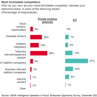 附图来自 GSMA 对国际运营商的调研,专网的最大跨界对手是无线网络设备提供商,而 IoT 最大跨界对手来自 IoT 平台商。