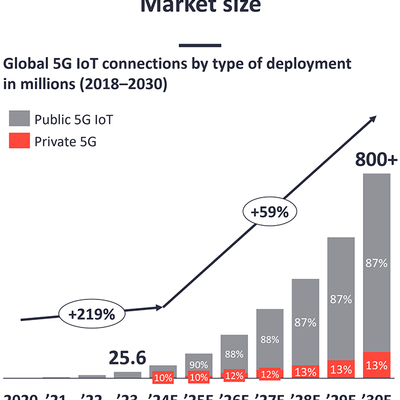 5G 专网的连接数占比会持续提升,预计到 2030 年有 13% 的 5G IoT 连接属于专网。