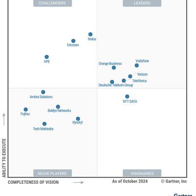 在领导者(Leaders)象限包含了 Vodfaone、Verizon、Telefonica、Orange Business 和 Deutsche Telekom 五家运营商,代表了国际专网市场最有影响力的标杆。