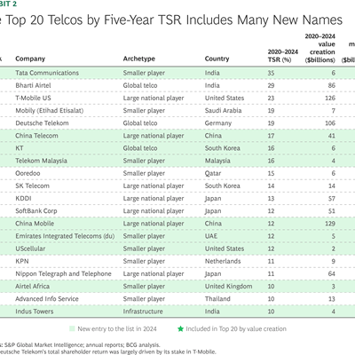 BCG 归纳了 2020 - 2024 TSR 总股东回报数据,附图是全球运营商 Top 20 排名。