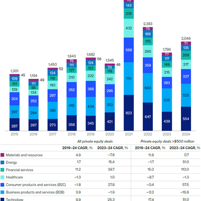 Mckinsey 基于 PitchBook 数据整理了,过去十年全球私募股权基金 PE 交易额和类型的统计情况。