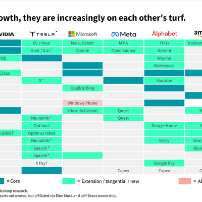 附图是美股七巨头(Magnificent Seven)在主要赛道的业务布局。