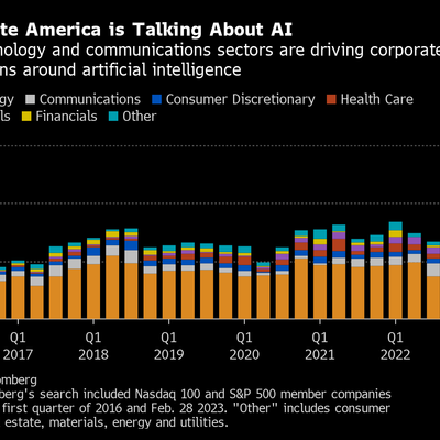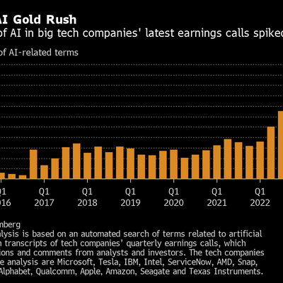 Bloomberg 对科技类上市公司的季度报告关键扫描显示,AI 出现的频次正在迅速加速,一举超出过去八年的历史数据。