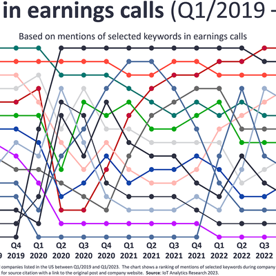 上市公司的财务报告提及的内容通常代表市场最热门动向。IoT Analytics 通过对美股上市公司的财务报告(季报)的关键字进行统计。