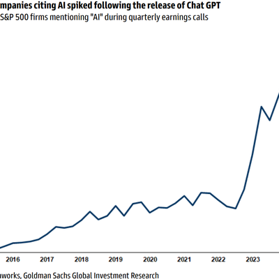 附图是 Goldman Sachs 针对 S&P 500 企业 2015 年至今的所有财报季报中提及 AI 比例。可以看到在 ChatGPT 发布之前,这个比例大约在 10~15% 左右。在 2022 年底 ChatGPT 爆发后,这个比例持续攀升,2024Q2 有 41% 的 S&P 企业提及了 AI。