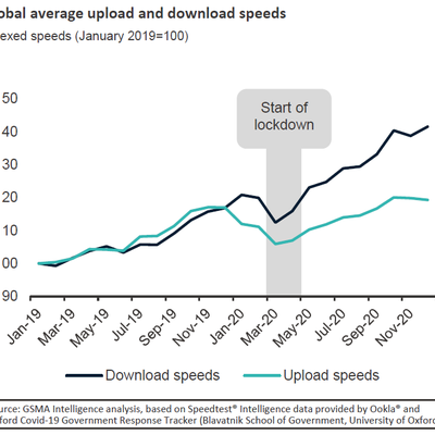 GSMA 基于 SpeedTest 的数据,做了一个全球平均网速的上下行对比。