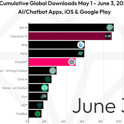 聊天类 AI 应用 / Chatbot 正在成为热门的应用下载类别。根据 data.ai 的数据监测,截止到 2023年6月3日,iOS AppStore 和 Google Play 商店里,下载最多的 AI 聊天对话式 App 前两名是 Ask AI 和 Character AI。