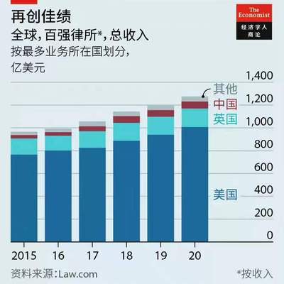Top 100 律所的收入近年来持续提升,美国主导了这个市场,2020 年收入达到了 1,000 亿美元。