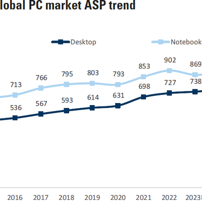 附图数据引自高盛的研究,2015 年全球 PC 台式机的平均单价为 516 美元,笔记本电脑平均单位单价为 689 美元。预计 2025 年台式机将达到 769 美元,笔记本电脑将达到 905 美元。