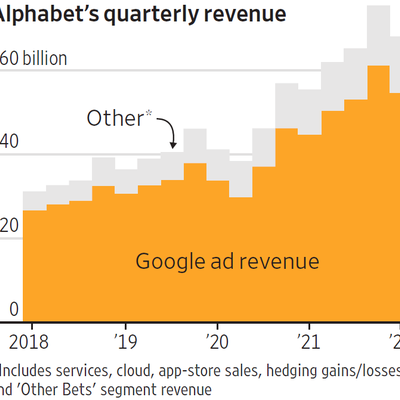 WSJ 绘制了一张图展示了 Alphabet(谷歌母公司)今年收入的构成。