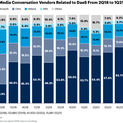 Gartner 针对社交媒体上围绕云桌面的讨论声量做了统计,Microsoft, Citrix, VMare, AWS 位居 Top 4 品牌。